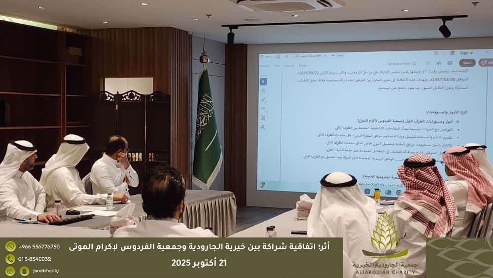 انطلاقًا من مبدأ التعاون والتكامل بين مؤسسات المجتمع، تم يوم الثلاثاء الموافق 21 / 10 / 2025م توقيع اتفاقية شراكة مجتمعية بين جمعية الجارودية الخيرية للخدمات الاجتماعية وجمعية الفردوس لإكرام الموتى وذلك بهدف توحيد الجهود وتعزيز التعاون المشترك وتنظيم العمل والمسؤوليات ذات العلاقة بخدمات إكرام الموتى، بما يخدم أفراد المجتمع ويحقق المصلحة العامة.