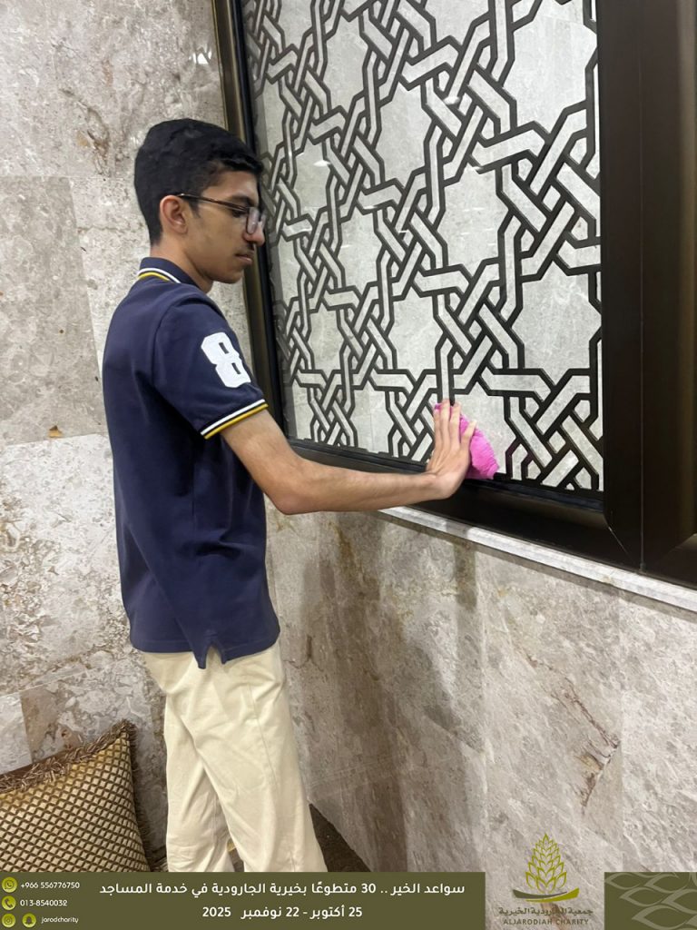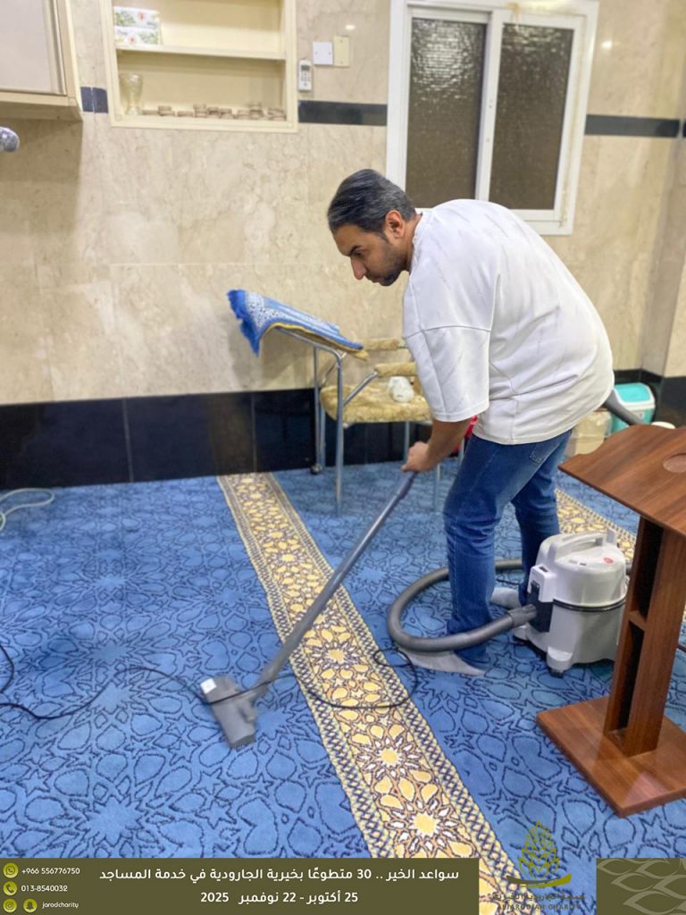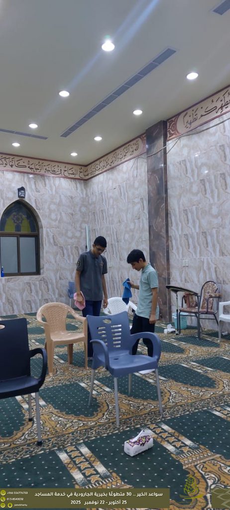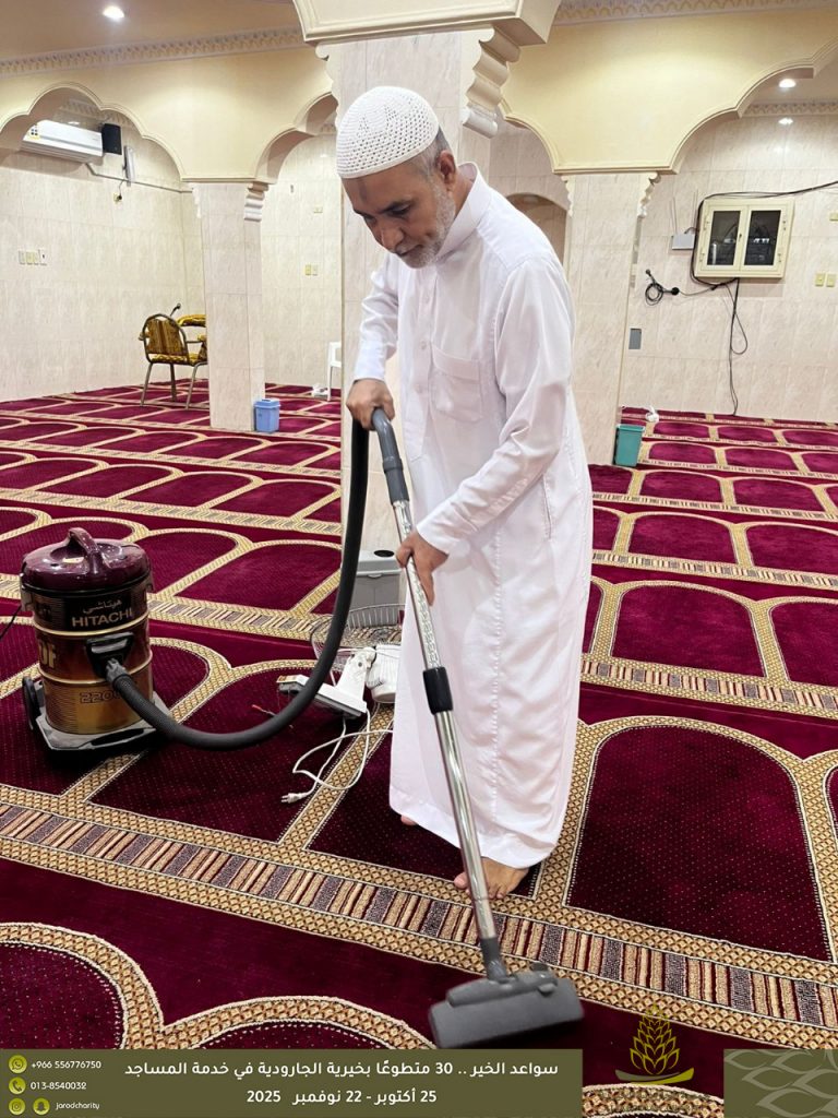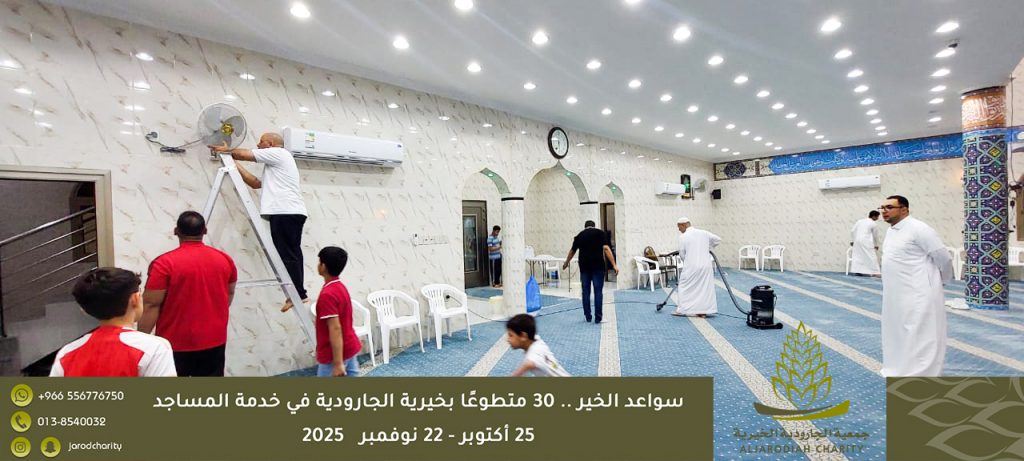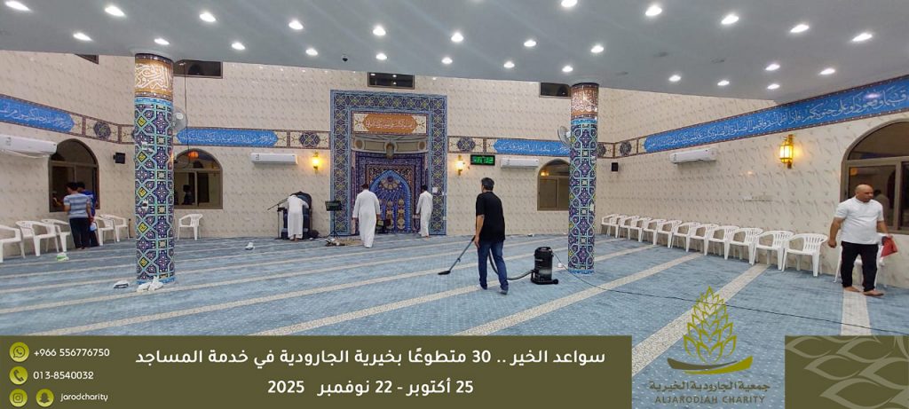 ضمن جهودها في تعزيز العمل التطوعي وخدمة المجتمع وتحت عنوان سواعد الخير، نفّذت خيرية الجارودية ممثلة بوحدة التطوع مبادرة لخدمة المساجد امتدت على مدى شهر كامل من 25 أكتوبر حتى 22 نوفمبر، بمشاركة 30 متطوعًا من أبناء المجتمع عملوا على تنفيذ عدد من المهام التي تعكس العناية الشاملة بمرافق المسجد لضمان بيئة نظيفة ومهيّأة للمصلين والمحافظة على جمالية المكان.