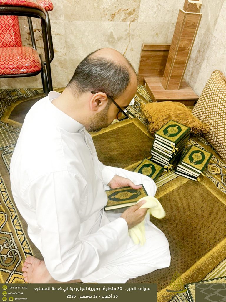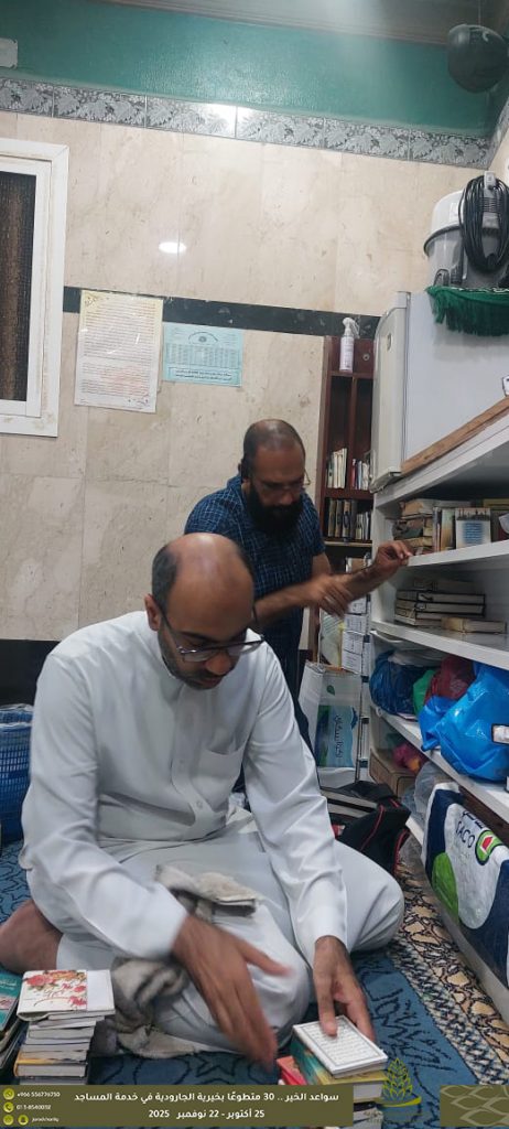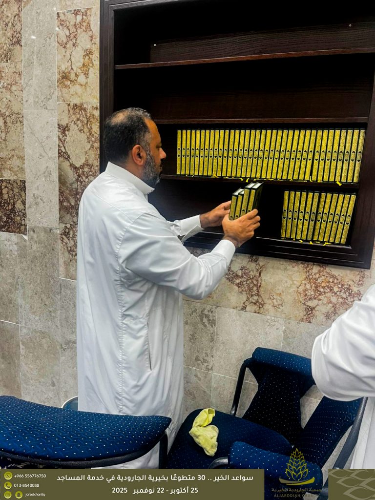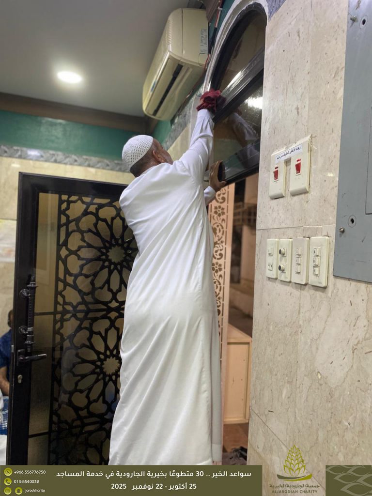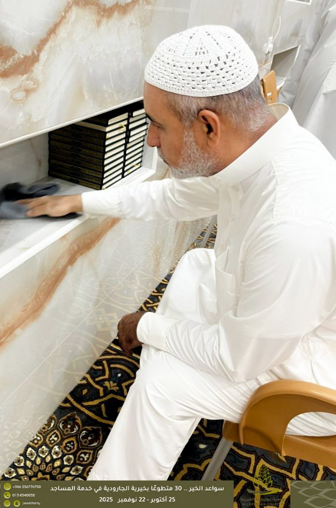 ضمن جهودها في تعزيز العمل التطوعي وخدمة المجتمع وتحت عنوان سواعد الخير، نفّذت خيرية الجارودية ممثلة بوحدة التطوع مبادرة لخدمة المساجد امتدت على مدى شهر كامل من 25 أكتوبر حتى 22 نوفمبر، بمشاركة 30 متطوعًا من أبناء المجتمع عملوا على تنفيذ عدد من المهام التي تعكس العناية الشاملة بمرافق المسجد لضمان بيئة نظيفة ومهيّأة للمصلين والمحافظة على جمالية المكان.