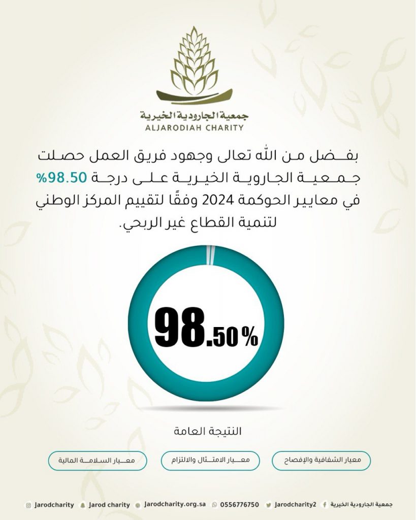 بفضل من الله وتوفيقه وجهود فريق العمل حصلت جمعية الجارودية الخيرية على درجة 98.50% في معايير الحوكمة 2024.